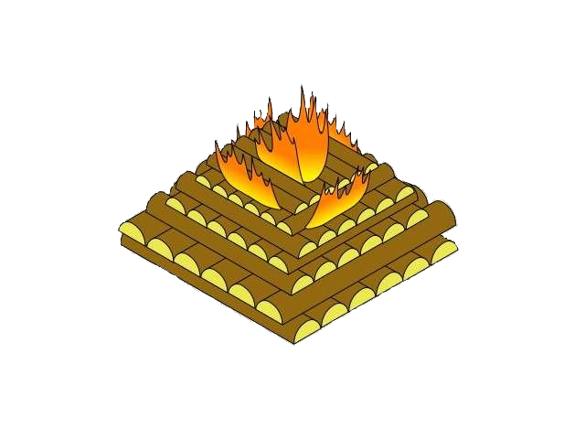 Этот костер представляет из себя пирамиду, каждый этаж которой выложен настилом из бревен, причем каждый последующий этаж кладется перпендикулярно предыдущему.